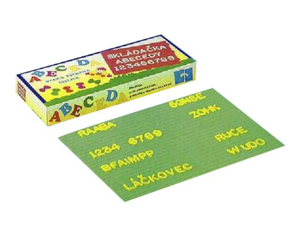 Zábavná skládačka ABC. Tato skládačka obsahuje všechny písmenka abecedy a podložky do kterých se písmenka dají vtlačit. Podložky jsou 4 a dají se spojit a vytvořit jednu větší. Děti si můžou tvořit různé slova, věty nebo nápisy a tím rozvíjet svoji slovní zásobu.