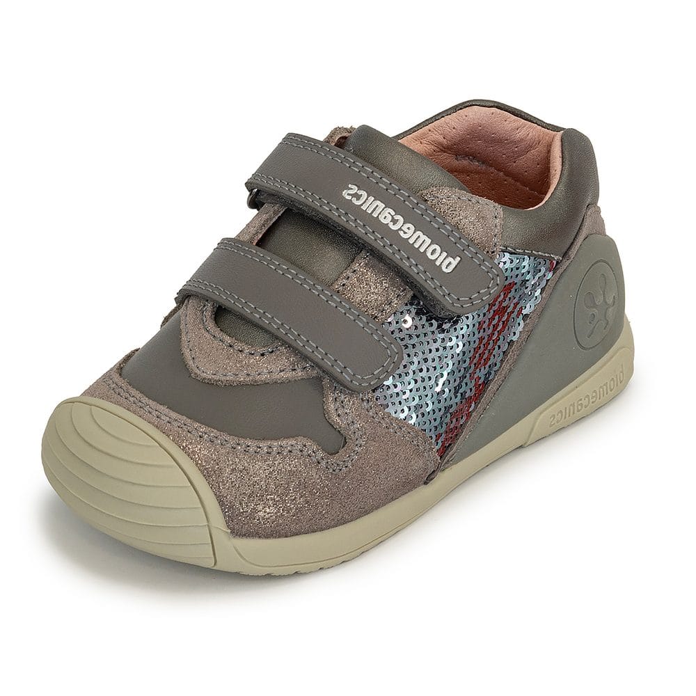 Dívčí celoroční boty, Biomecanisc, 241104-A213,v šedé barvě s motivem srdíček a třpitkami. Dětské boty Biomecanics 241104-A213 v šedé barvě s dívčím motivem srdíček se třptkami jsou vyrobené z hladké kůže a kombinují prvky barefoot obuvi s tradičním designem. Jsou navrženy tak, aby podporovaly přirozený pohyb dětské nohy a zajišťovaly maximální komfort při každém kroku.
