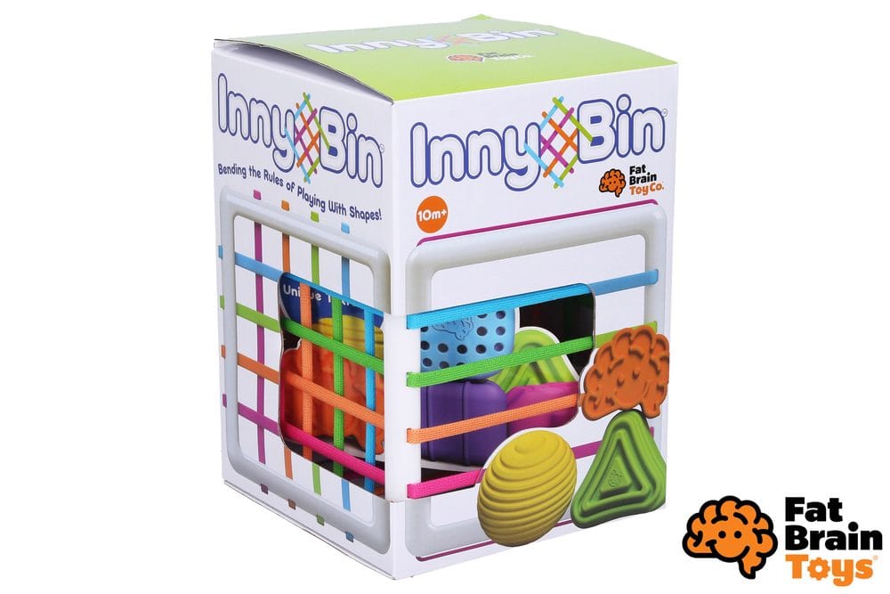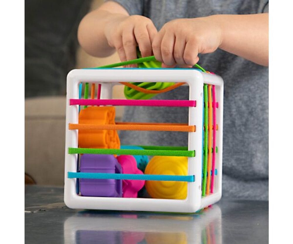 InnyBin mřížkovaná vkládačka. Rám kostky je z plastu. Mřížku tvoří elastické provázky. Různě tvarované dílky se nejdříve vloží dovnitř skrze elastickou mřížku a poté se vytahují ven. InnyBin mřížkovaná vkládačka. Rám kostky je z plastu. Mřížku tvoří elastické provázky. Různě tvarované kostky z měkkého materiálu lze jednoduše prostrkávat skrz mřížku.