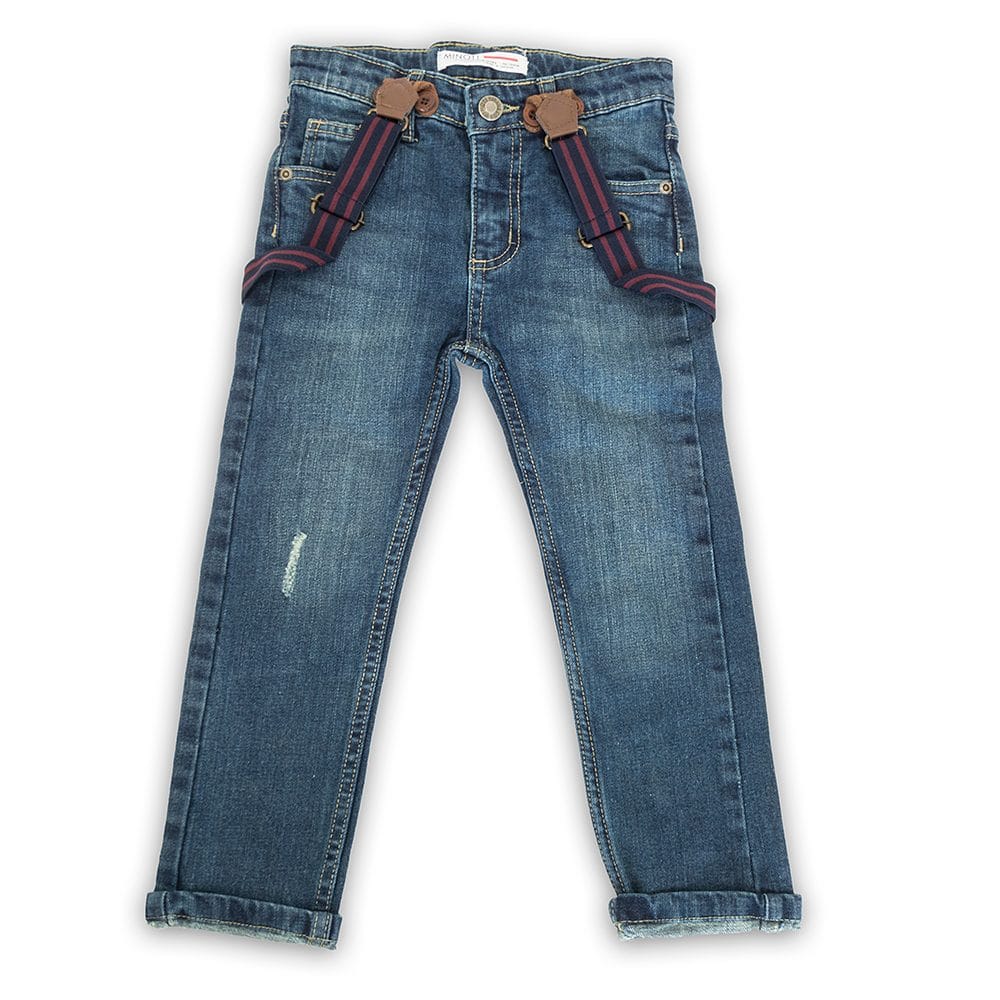 kalhoty džínové se šlemi, Minoti, TRADE 12 Dětské riflové kalhoty se šlemi. Kalhoty mají klasické zapínání na knoflík a zip, dvě zadní a dvě boční kapsy.