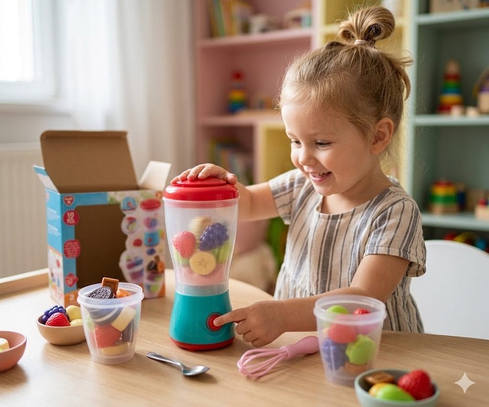 Interaktivní mixér 2v1 (21 cm) se světelnými efekty a bohatým příslušenstvím. Lze jej použít i jako přenosný kelímek s brčkem. Baterie součástí balení.