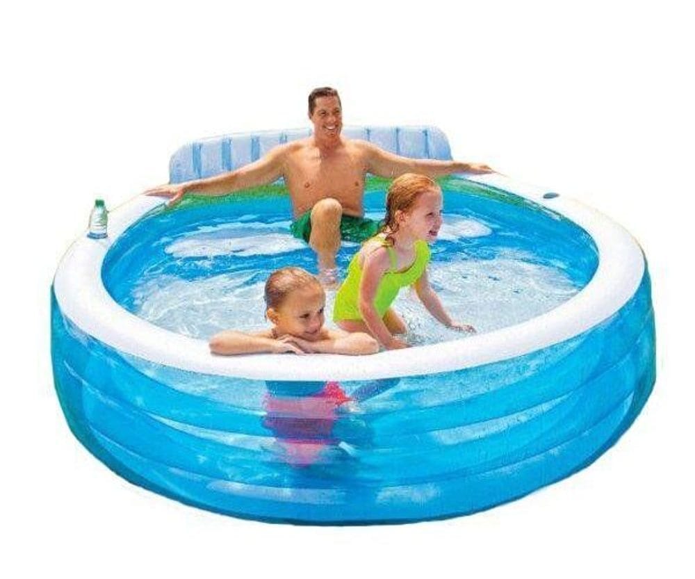 Nafukovací rodinný bazén, velikost: 229 x 218 x 79 cm, objem 590 l, výška hladiny 30 cm, vinyl 0,33 mm, zabudovaná lavička s opěradlem, 2 držáky na lahve, 2 vzduchové komory, 2 kombinované ventily, vypouštěcí ventil, sada na opravu Pohodlný nafukovací bazén INTEX s vestavěným sedátkem a opěradlem poslouží k příjemnému ovlažení v horkých letních dnech! Užijte si vodní radovánky společně s vašimi dětmi v rodinném bazénu!