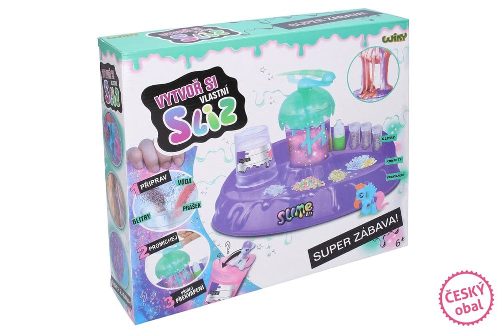 Kreativní sada na výrobu slizu, 1x továrna na sliz, 3x kelímek, 6x hmota pro výrobu slizu, 3x sáček s třpytkami, 6 barev, figurky, nálepky, nástrojem, doporučený věk od 6 let Vyrob si vlastní sliz s touto super sadou! Stačí smíchat přísady správným způsobem a zábava může začít! Sliz můžeš libovolně natahovat, mačkat a tvarovat! Továrna na sliz je včetně vybavení potřebného pro vlastní výrobu.